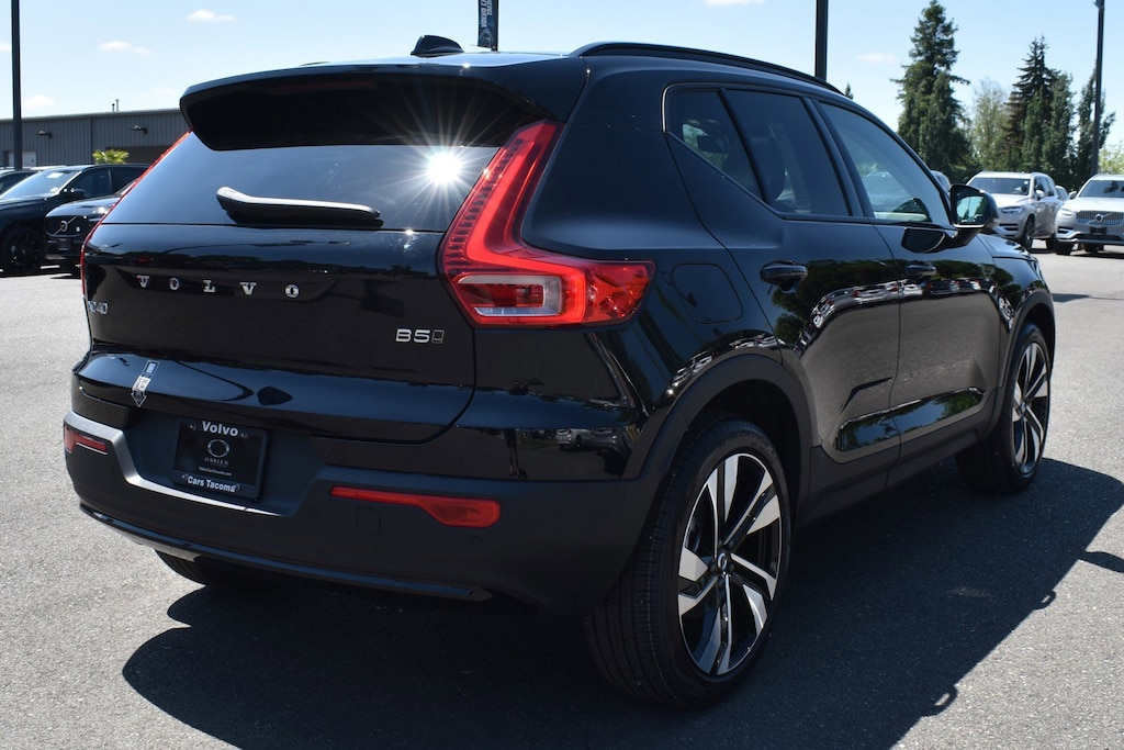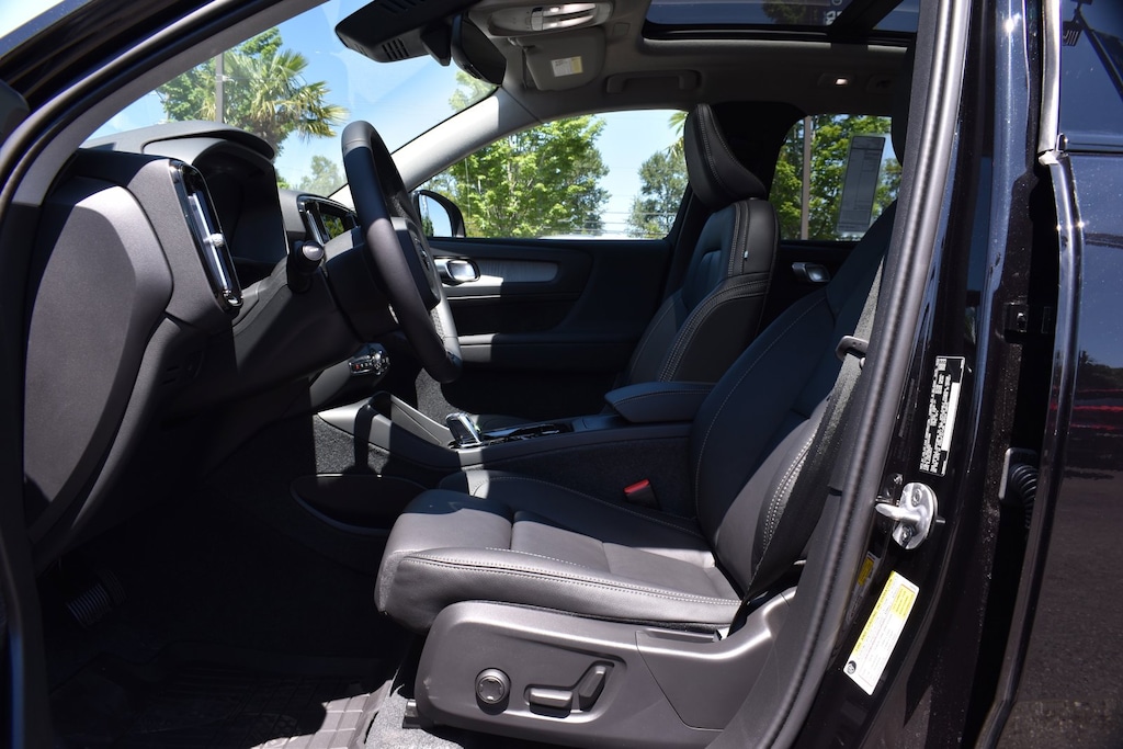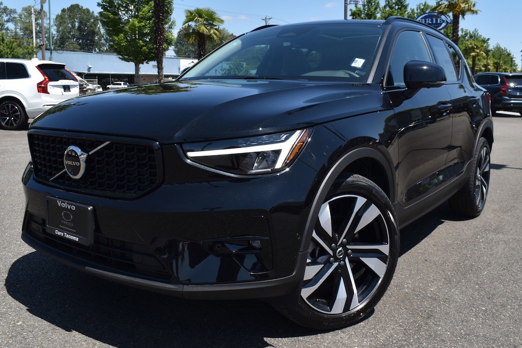 Onyx Black 2024 Volvo XC40 B5 Plus Dark Theme AWD Automatic with Geartronic 2.0L I4 Turbocharged DOHC 16V LEV3-ULEV70 4-Wheel Disc Brakes, 8 Speakers, ABS brakes, Air Conditioning, Alloy wheels, AM/FM radio: SiriusXM, Apple CarPlay, Auto High-beam Headlights, Auto-dimming door mirrors, Auto-dimming Rear-View mirror, Automatic temperature control, Brake assist, Bumpers: body-color, Connect Suede Textile/Microtech Seating Surfaces, Delay-off headlights, Driver door bin, Driver vanity mirror, Dual front impact airbags, Dual front side impact airbags, Electronic Stability Control, Emergency communication system, Exterior Parking Camera Rear, Four wheel independent suspension, Front anti-roll bar, Front Bucket Seats, Front Center Armrest, Front dual zone A/C, Front fog lights, Front reading lights, Fully automatic headlights, Garage door transmitter: HomeLink, Heated door mirrors, Heated Front Seats, Heated front seats, Illuminated entry, Internet access capable: Digital Services Package w/ 4 Year Subscription, Knee airbag, Low tire pressure warning, Memory seat, Navigation System, Occupant sensing airbag, Outside temperature display, Overhead airbag, Overhead console, Panic alarm, Passenger door bin, Passenger vanity mirror, Power door mirrors, Power driver seat, Power Liftgate, Power moonroof, Power passenger seat, Power steering, Power windows, Radio data system, Radio: 250W High Performance Audio System, Rain sensing wipers, Rear anti-roll bar, Rear fog lights, Rear reading lights, Rear seat center armrest, Rear window defroster, Rear window wiper, Remote keyless entry, Roof rack: rails only, Security system, Speed control, Speed-sensing steering, Split folding rear seat, Spoiler, Steering wheel mounted audio controls, Tachometer, Telescoping steering wheel, Tilt steering wheel, Traction control, Trip computer, Turn signal indicator mirrors, Variably intermittent wipers, Wheels: 19" 5-Y Spoke Matte Graphite Alloy.